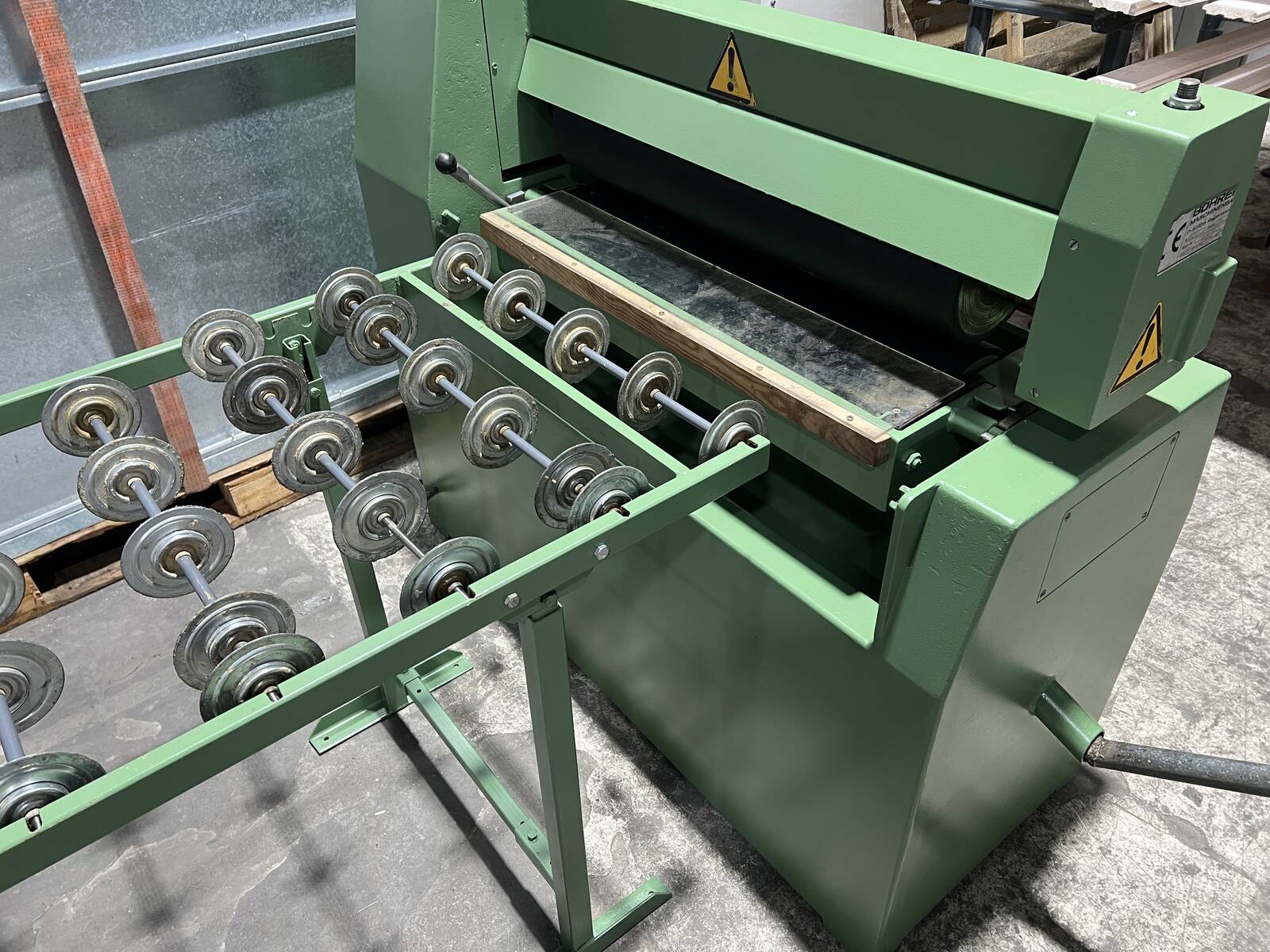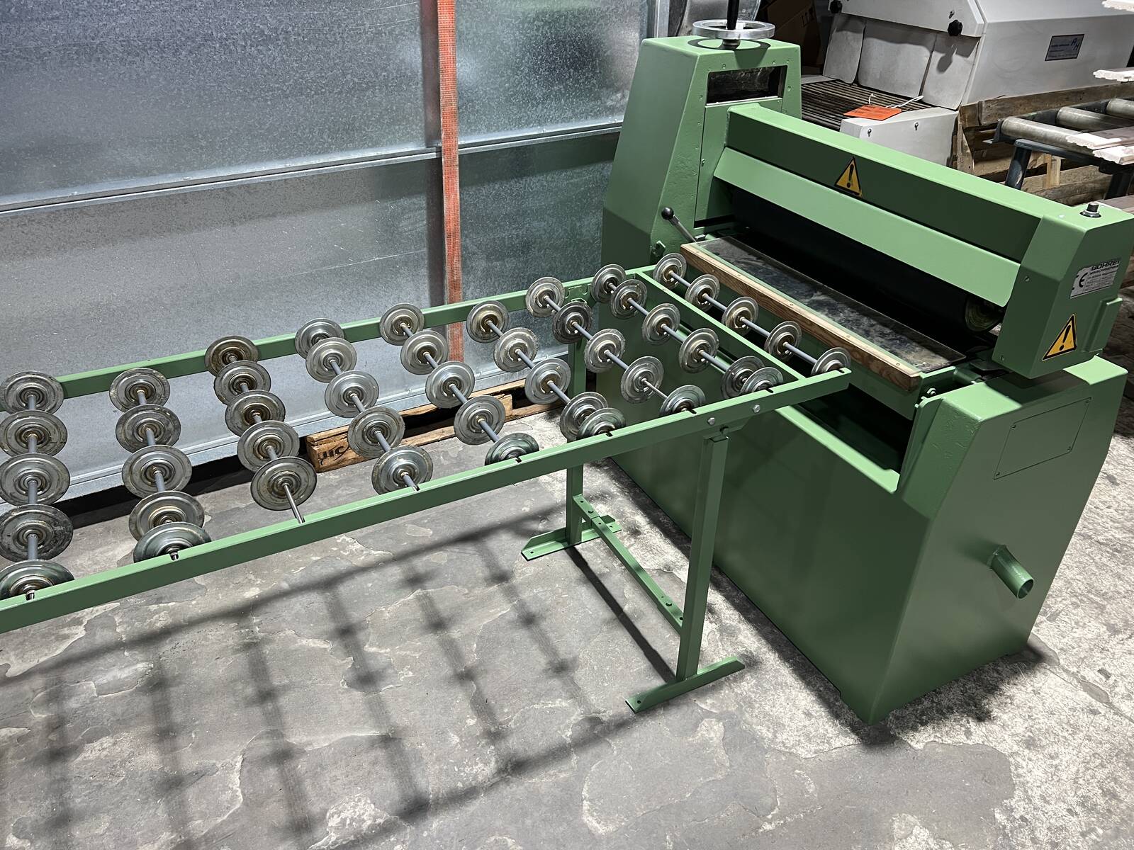 Двусторонняя машина для нанесения клея, с дисковым роликовым транспортером на выходе.
